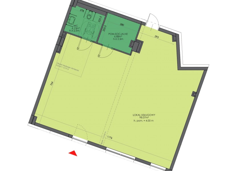 Wejście i witryny: od strony południowej, co zapewnia doskonałą ekspozycję i duże nasłonecznienie lokalu przez większość dnia. Idealne rozwiązanie do prowadzenia działalności, której zależy na widoczności i atrakcyjnej prezentacji oferty.