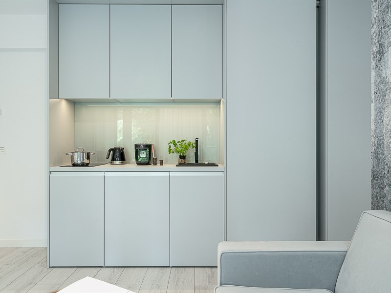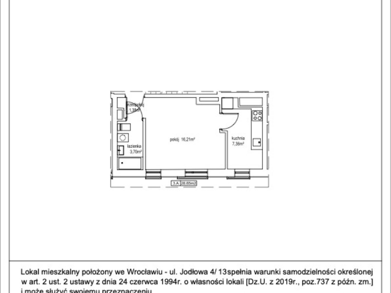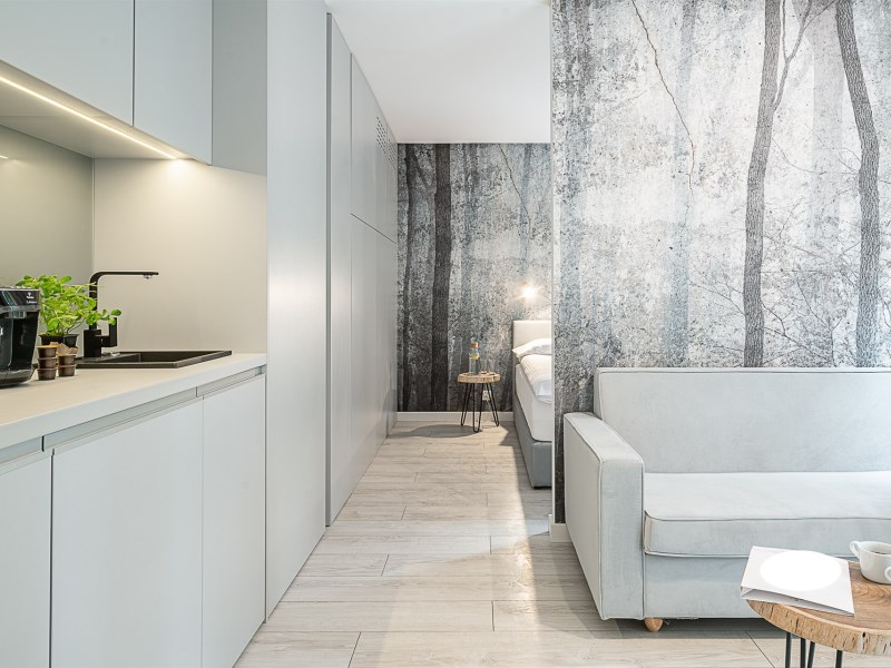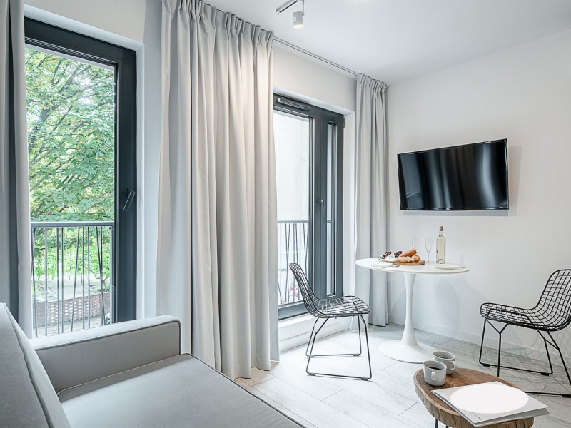 Mieszkanie o powierzchni 28,65 m² położone jest na trzecim piętrze nowoczesnego budynku z windą. Układ sprytnie łączy zalety metrażu typu studio z funkcjonalnością pełnoprawnego „dwupokoju”: część dzienna pozostaje jasna i reprezentacyjna, a sypialnia zapewnia codzienną prywatność. Tuż obok odnowiony plac Nowy Targ zamienił się w zieloną enklawę – miejsce porannych spacerów, spotkań i chwili oddechu – a do Rynku dochodzi się w zaledwie kilka minut.