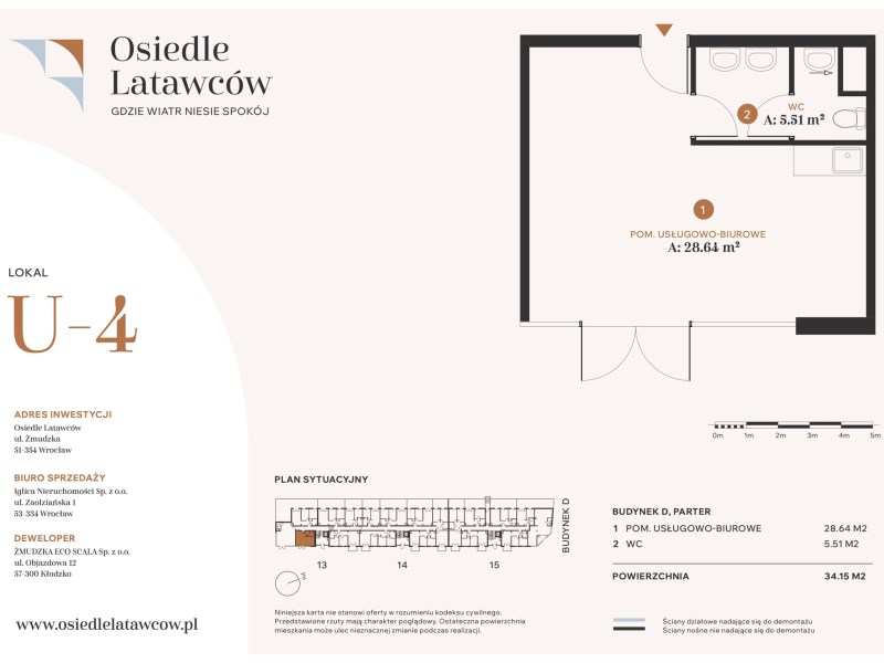 Na sprzedaż lokal handlowo-usługowy, zlokalizowany na parterze budynku C w ramach inwestycji Osiedle Latawców przy ul. Żmudzkiej w północnej części Wrocławia. Duże witryny od podłogi do sufitu zapewniają świetną ekspozycję i naturalne doświetlenie wnętrza. Istnieje możliwość połączenia z sąsiednimi lokalami w większą powierzchnię, dopasowaną do potrzeb przyszłego właściciela.