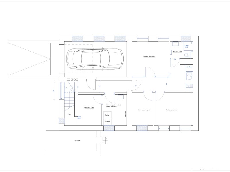 W przyziemiu znajduje się garaż o powierzchni 16,62 m² (wliczony do powierzchni użytkowej), pomieszczenia gospodarcze, pralnia oraz wyjście do ogrodu.