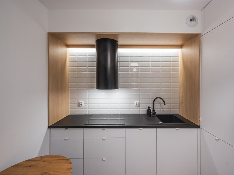 W kuchni: meble w zabudowie, płyta, piekarnik, lodówka, zmywarka