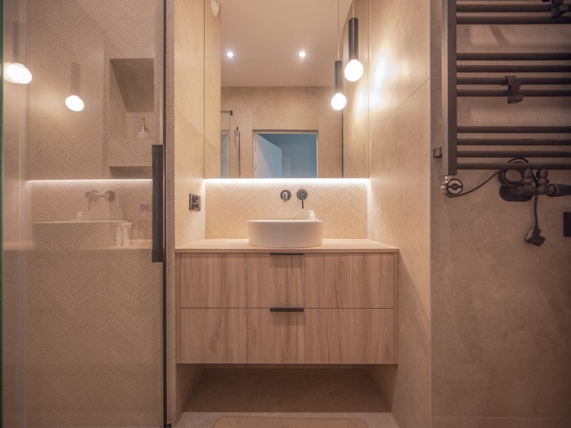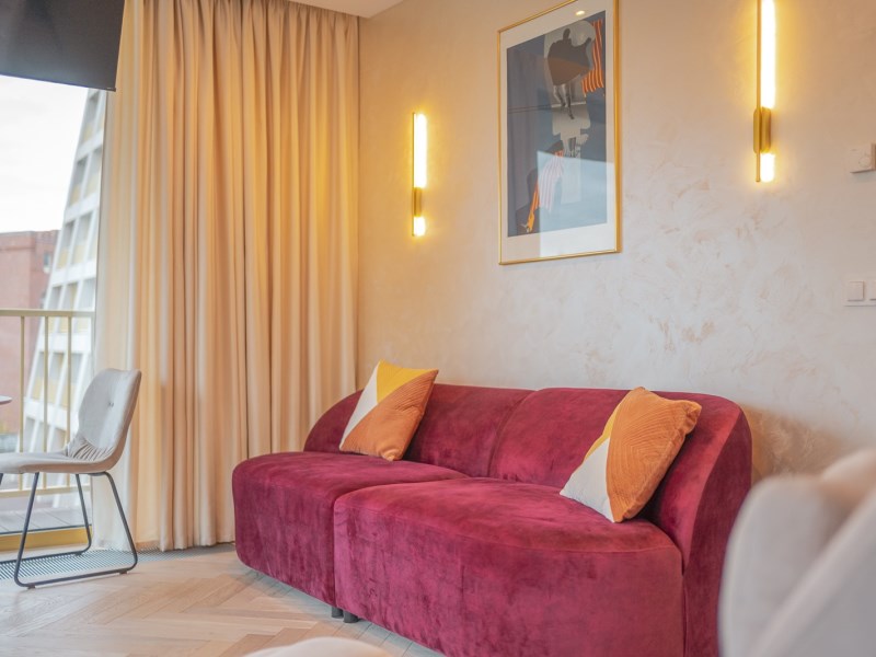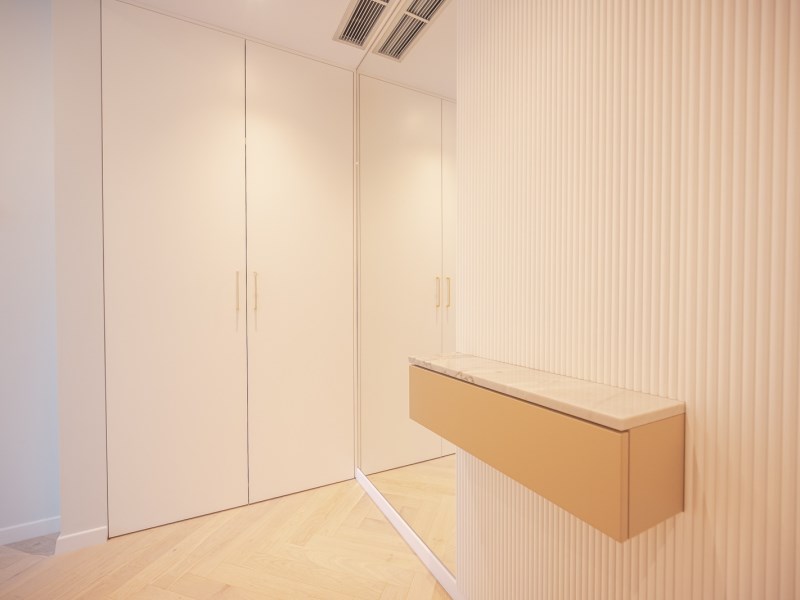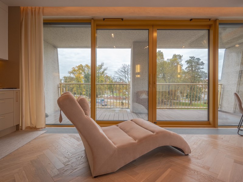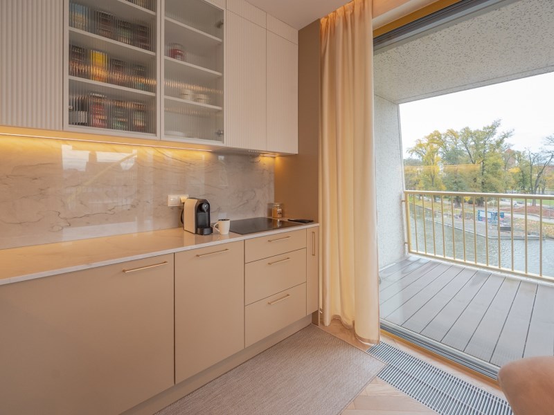 Wnętrze zaprojektowano z wyczuciem: przestronny salon z panoramicznymi oknami, sypialnia z miękkim światłem poranka, w pełni wyposażona kuchnia gotowa na poranne espresso i kolację przy winie. Każdy detal został przemyślany — od oświetlenia, przez meble, po tkaniny.