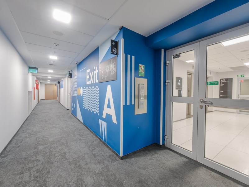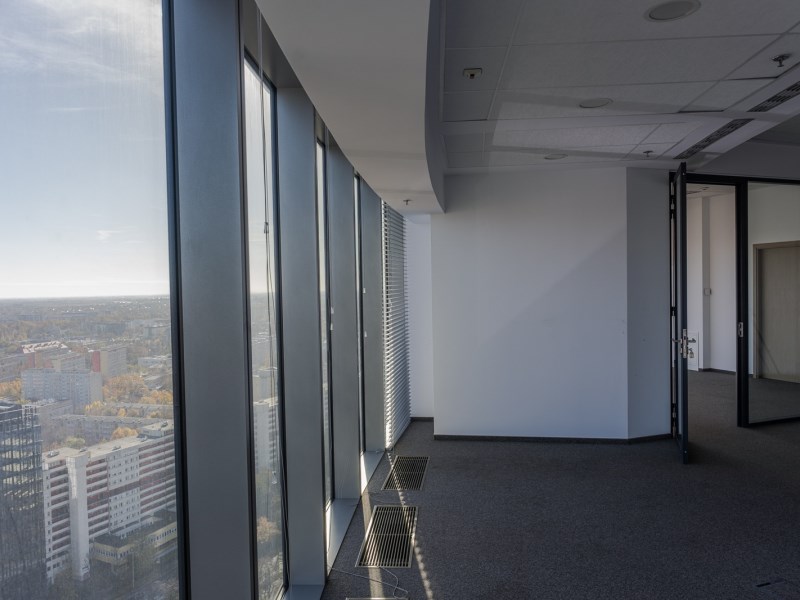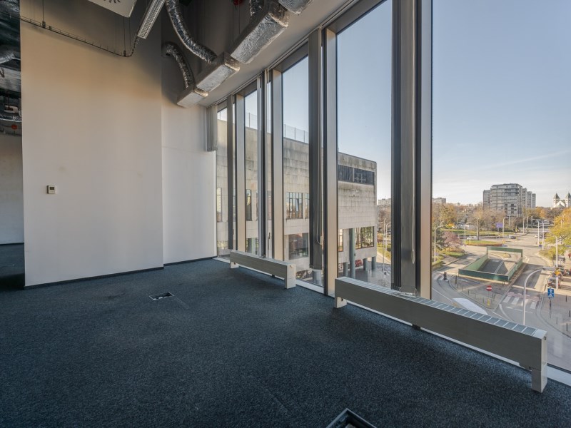 Dzięki dużym przeszkleniom wnętrze jest doskonale doświetlone naturalnym światłem, co pozytywnie wpływa na komfort pracy. Z okien rozpościera się niepowtarzalny widok na panoramę Wrocławia, dodający prestiżu i wyjątkowego charakteru miejscu.