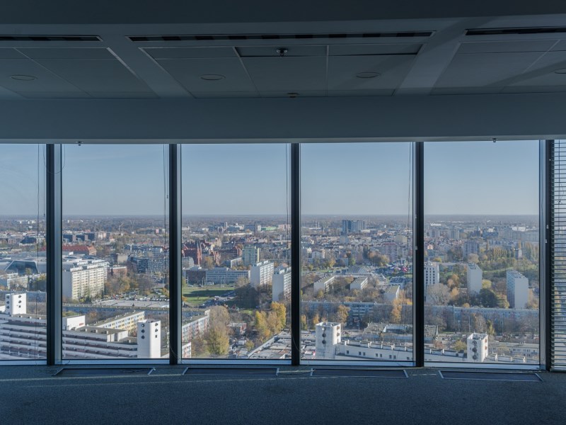 Dzięki dużym przeszkleniom wnętrza są jasne i pełne naturalnego światła, co sprzyja efektywnej i komfortowej pracy. Z okien rozpościera się imponujący widok na panoramę Wrocławia, podkreślający prestiż i wyjątkowy charakter tego miejsca.