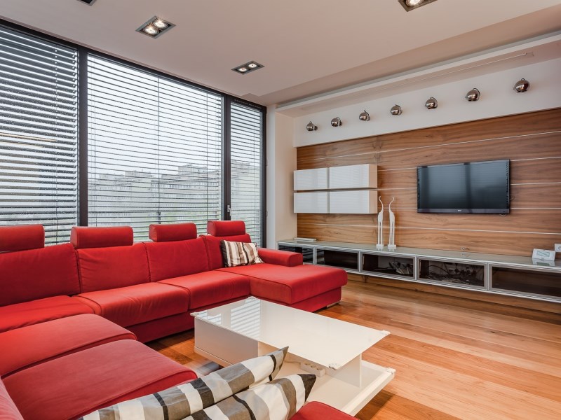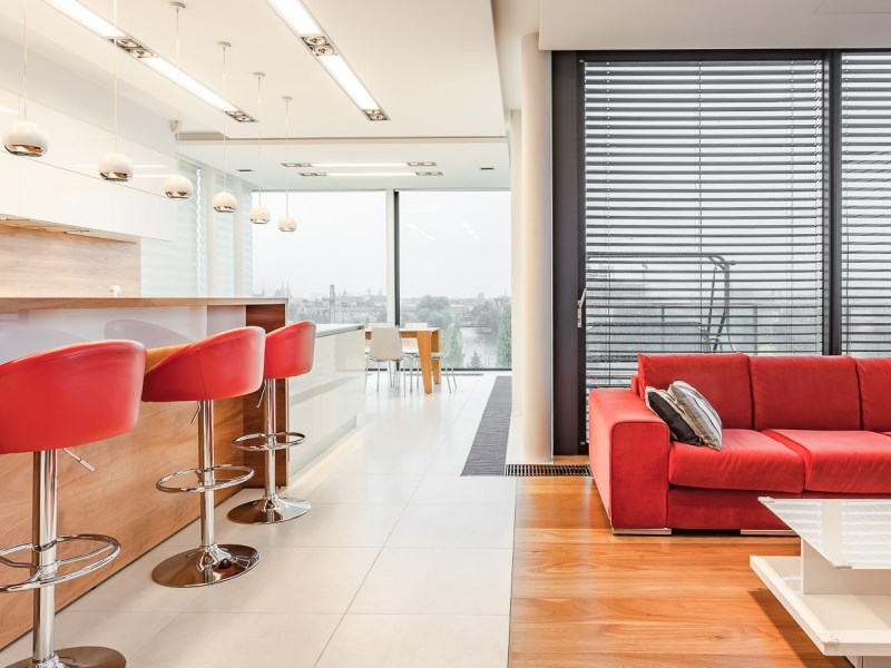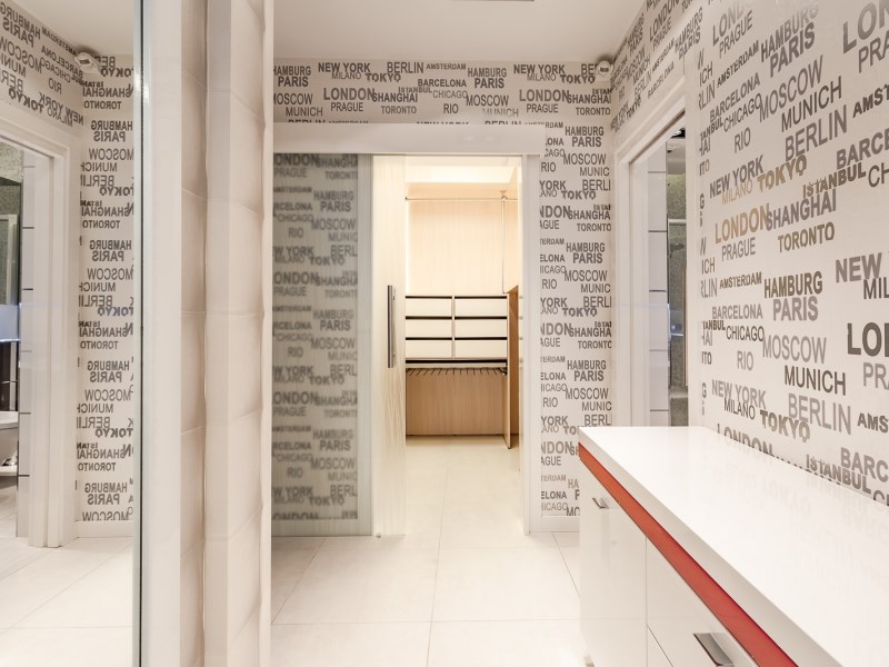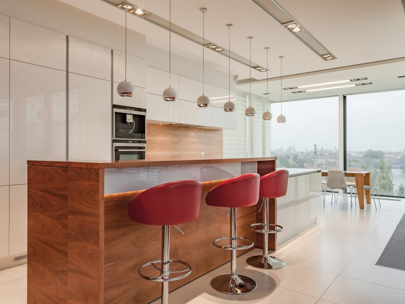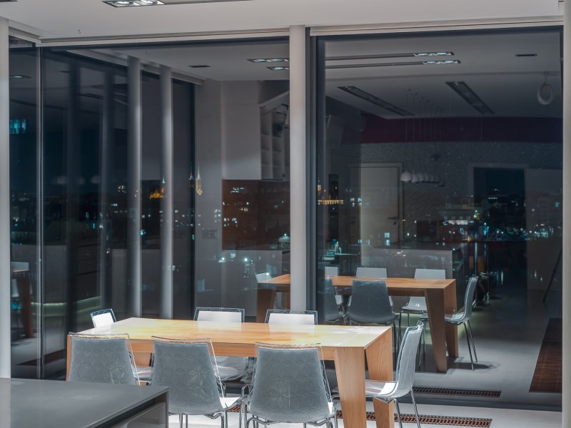Największym atutem mieszkania jest imponujący salon w kształcie litery „L”, otoczony ponad trzymetrowymi przeszkleniami. Dzięki temu wnętrze jest jasne przez cały dzień, a widok na panoramę Wrocławia oraz górę Ślęża robi ogromne wrażenie. Po zmroku przeszklone ściany zamieniają salon w prawdziwy punkt widokowy – rozświetlone miasto tworzy spektakularną scenerię, która dodaje wnętrzu niepowtarzalnego, luksusowego klimatu.