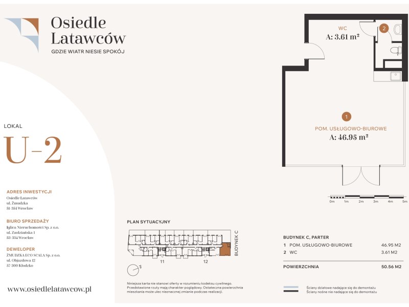 Na wynajem narożny lokal handlowo-usługowy, zlokalizowany na parterze budynku C w ramach inwestycji Osiedle Latawców przy ul. Żmudzkiej w północnej części Wrocławia. Duże witryny od podłogi do sufitu zapewniają świetną ekspozycję i naturalne doświetlenie wnętrza. Istnieje możliwość połączenia z sąsiednimi lokalami w większą powierzchnię, dopasowaną do potrzeb przyszłego właściciela.
